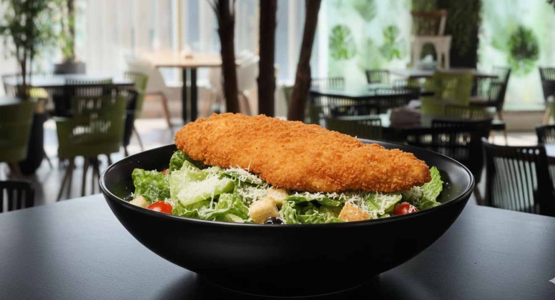 کاهو، فیله مرغ سوخاری، زیتون، نان تست، پنیر پارمسان،، سس مخصوص، گوجه گیلاسی